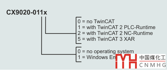 CX9020嵌入式控制器根據(jù)其操作系統(tǒng)和編程軟件的不同,被分成很多不同的版本。其訂貨號的最后兩位用來表示控制器的操作系統(tǒng)類型及是否帶有TC運行庫,具體定義請看下面的圖片: