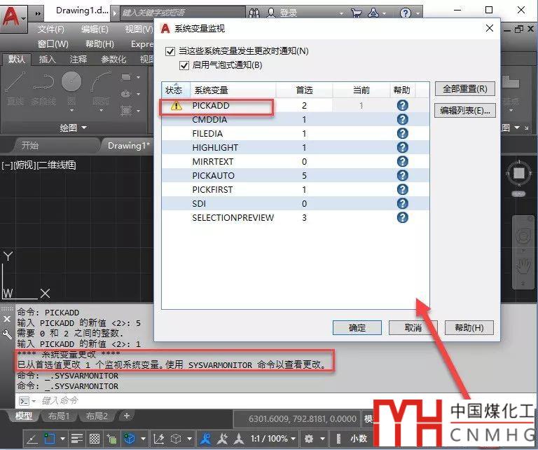 在AUTOCAD高版本會監(jiān)視一些關(guān)鍵變量的變化,如果這些變量被修改時,比如我們修改了累加選擇PICKADD的變量后,命令行會提示關(guān)鍵系統(tǒng)變量被修改,同時狀態(tài)欄右下角會彈出氣泡提示,雙擊可以打開“系統(tǒng)變量監(jiān)視器”,如下圖所示。