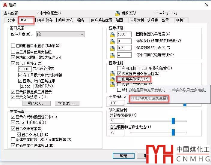 CAD的設(shè)置選項主要集中在選項OP對話框、草圖設(shè)置DSETTINGS等幾個對話框中,如果遇到一些顯示、選擇、繪圖輔助工具等相關(guān)問題,可以先去這些對話框里去找找有沒有相關(guān)設(shè)置。比如填充不顯示,就可以到選項對話框的顯示選項卡中找一下相關(guān)設(shè)置,如下圖所示。