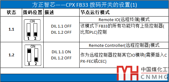 第一組撥碼開關(guān)用來設(shè)置總線節(jié)點(diǎn)的運(yùn)行模式。CPX-FB33支持兩種運(yùn)行模式:遠(yuǎn)程終端(Remote IO)模式和遠(yuǎn)程控制器(Remote Controller)模式,設(shè)置的方式如下圖: