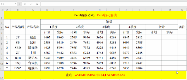 在目標(biāo)單元格中輸入公式:=SUMIF($D$4:$K$4,L$4,$D5:$K5)。