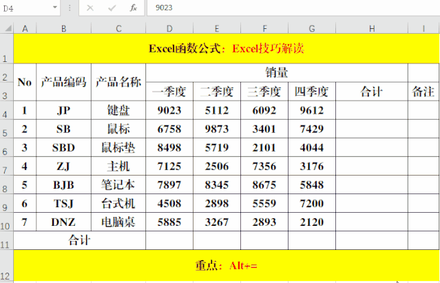 一般情況下,求和使用Sum函數(shù)完成的,而此時(shí)用Alt+=組合鍵來(lái)代替,所以,Alt+=組合鍵可以看成是Sum函數(shù)的快捷鍵!