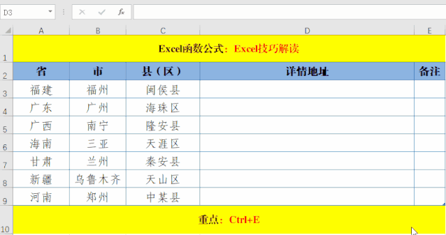 Ctrl+E為智能填充的快捷鍵,除了智能組合外,還可以智能提取或分割等。