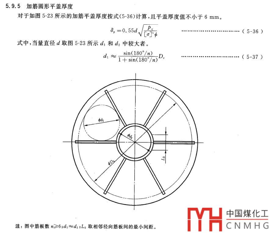 HG20582-2011第20章,帶加強(qiáng)筋的圓形平蓋設(shè)計(jì)計(jì)算,如下圖: