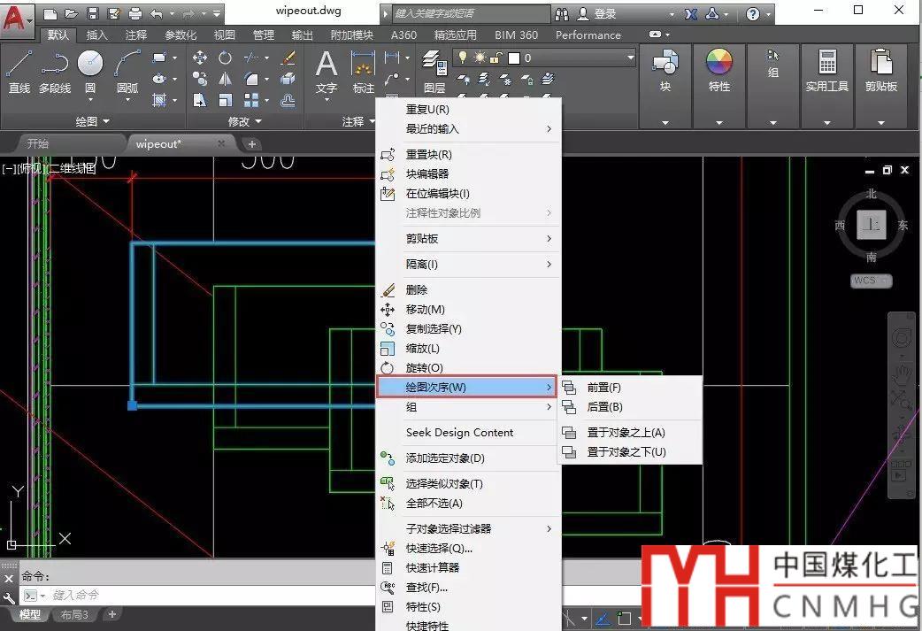 調(diào)整圖形順序的命令是繪圖次序(DRAWORDER),命令不難記,draw繪圖,order順序。但從右鍵菜單中調(diào)用更加方便。