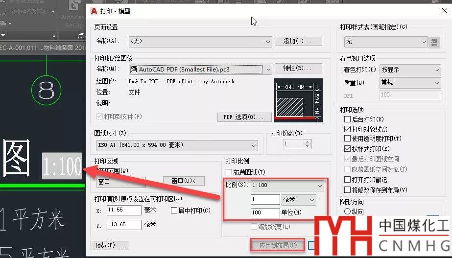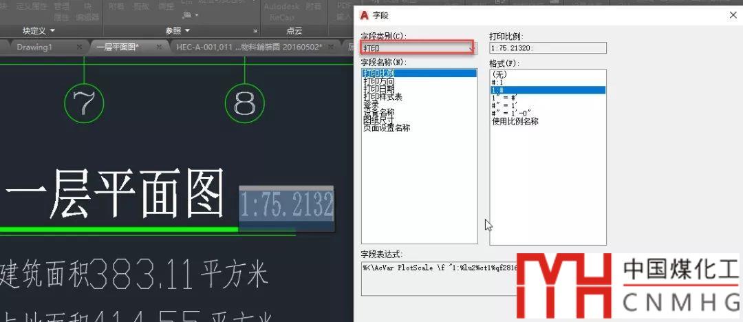 在打印對話框里設(shè)置打印比例后“應(yīng)用到布局”就可以保存頁面設(shè)置,但圖面上的字段并不會立即更新,但沒有關(guān)系,輸入RE刷新,或者打印時(shí)這個(gè)字段就會更新,如下圖所示。