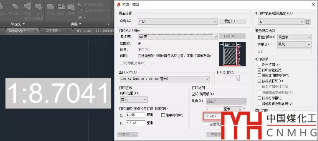 CAD里提供了多種打印比例的格式,可以根據(jù)需要選擇一種。插入后會顯示一個(gè)比例,如果圖紙沒有設(shè)置和保存頁面設(shè)置,顯示的比例和打印對話框中的比例可能會不一樣,如下圖所示。