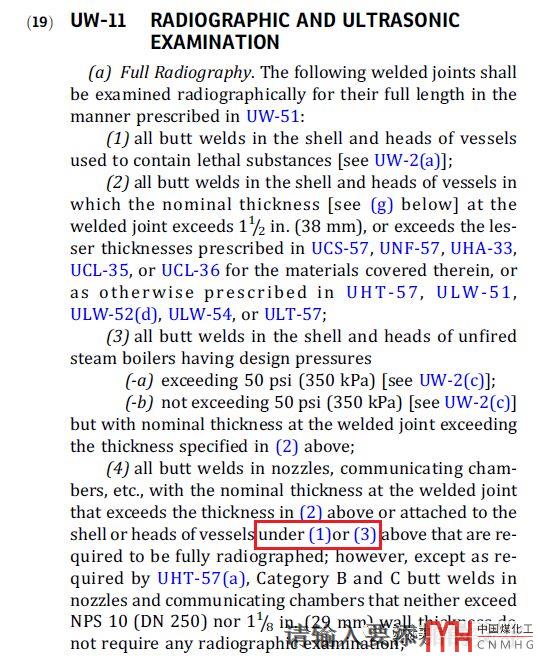 UW-11:刪除了(a)(4)引用的(2),也就是說殼體厚度大于38mm的僅是殼體焊縫需要FULL RT,殼體上的接管等是不需要的。厚板要求對接接頭全部無損檢測是從焊接缺陷方面考慮的,和接管本身的對接接頭沒什么關(guān)系。所以2019版又刪除了這個要求。