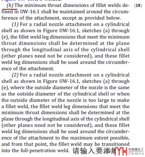 UW-16:制造廠的設(shè)計可能都遇到過車間反饋,開孔很大的接管(接管直徑/筒體直徑大于0.7)尤其是接近三通的,只要圖紙要求的焊腳稍大車間就會說無法滿足要求。2019版標(biāo)準(zhǔn)給設(shè)計人員撐腰了可以不用車間為難了,標(biāo)準(zhǔn)明確焊腳的要求只是殼體縱向的,其它方向可不滿足但要保證焊腳的變化是連續(xù)的(就是在保證接管上和殼體上的焊接尺寸不變,不用管實際的喉高是多少。如筒體軸向焊腳喉高是10mm的話,環(huán)向有時連5mm都沒有)。