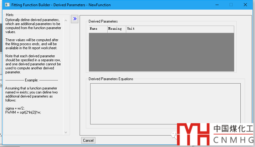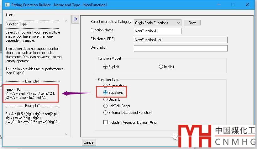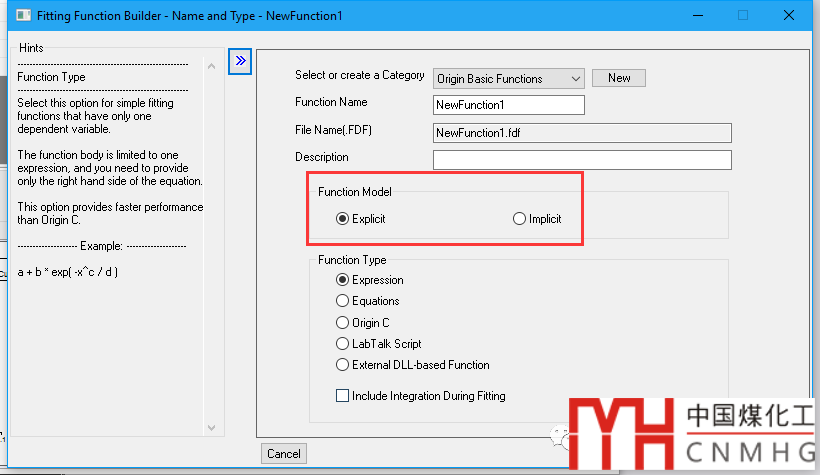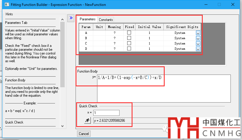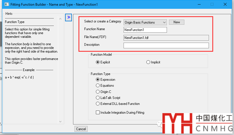 Create New Fitting Function:根據(jù)Fitting Function Builder向?qū)?,完成自定義函數(shù)。左側(cè)為Hints,顯示每一步的提示與幫助。