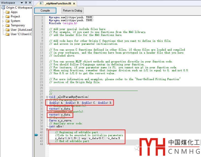 Use Custom Code:點擊右側(cè)的按鈕,打開Code Builder界面,在//Code to be executed to initialized parameters下面輸入 y_data=1/A+1/B*(1-exp(-x_data*B/C))+x_data/D(注意與函數(shù)體的差別),點擊Compile,查看編輯結(jié)果。