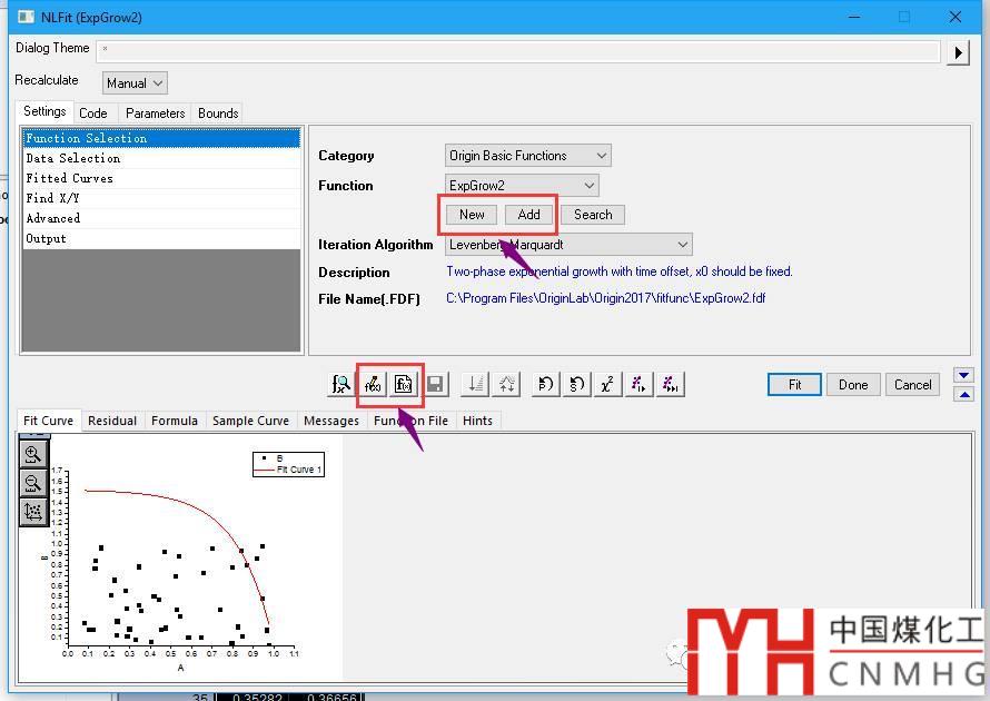 使用函數(shù)擬合窗口中部的Edit Fitting Function或者Create New Fitting Function按鈕來自定義函數(shù),也可以使用OriginPro 2017中新增的New或者Add快捷按鈕來完成,同時也可以使用各個函數(shù)Category下的Add或者New來完成。
