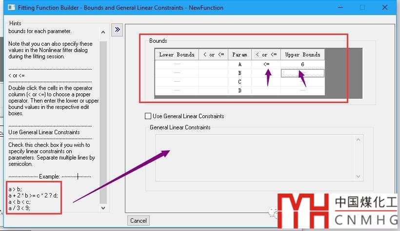 Bounds and General Linear Constraints:設(shè)置參數(shù)的邊界與約束條件。單擊< or <=欄變換邊界類型,雙擊Lower/Upper Bounds欄輸入邊界數(shù)字。
