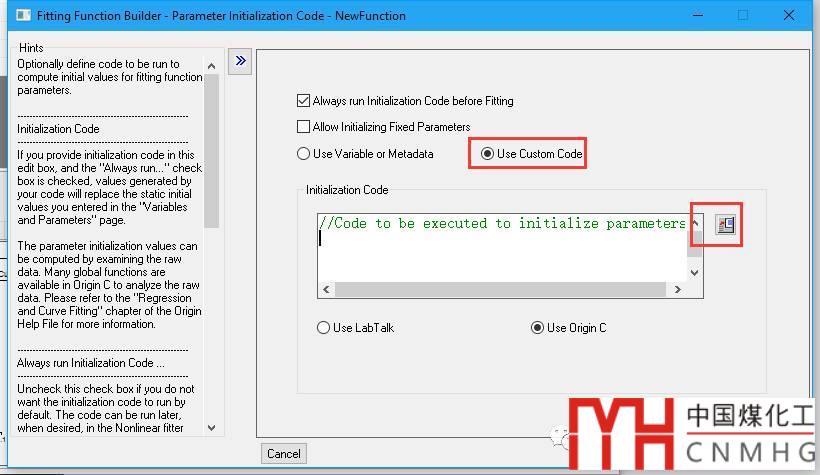 Parameter Initialization Code:參數(shù)的初始化。OriginPro2017版本提供了使用Variable或者Metadata來初始化參數(shù)的方法,同時也保留了使用Code來初始化參數(shù)的方法。