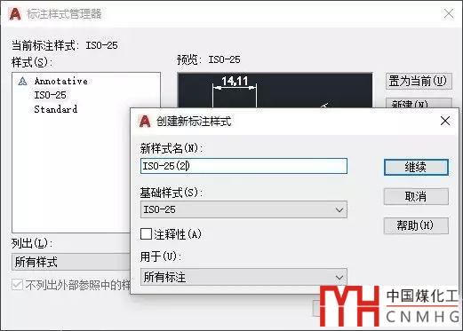 在左側(cè)的樣式列表中選中ISO-25,單擊"新建"按鈕,以此樣式為基礎(chǔ),建立一個ISO-25(2)的標注樣式,如圖所示。
