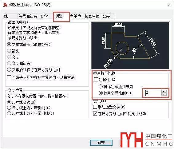 在“新建標注樣式”對話框中單擊繼續(xù)按鈕,進入新建標注樣式:ISO-25 (2)對話框,單擊頂部的“調(diào)整”選項卡,找到“標注特征比例”選項組,在使用全局比例中輸入2,如圖所示。