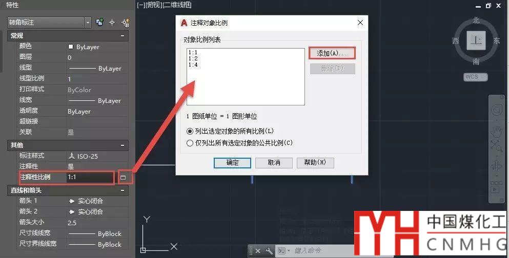 打開特性面板(CTRL+1),選中標注,找到注釋性比例欄,單擊后面的按鈕,打開“注釋對象比例”對話框,在對話框中添加1:2,1:4兩種比例,如圖所示。
