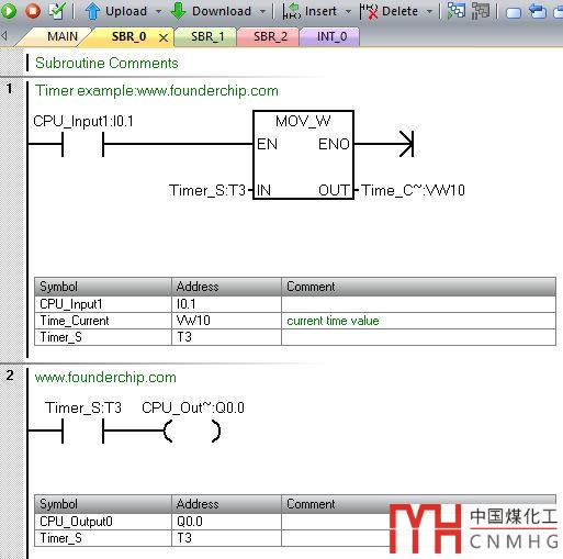 定時器(Timer)用來計時。S7-200 Smart定時器的時間基準有1ms,10ms和100ms三種。定時器有兩種變量:當前值(Current value)和定時器位(Timer bit)。當前值是一個16位的無符號整數(shù),用來記錄當前的時間;定時器位是一個位(bit),用來記錄定時器是否已經(jīng)被觸發(fā)(當前值大于設(shè)定值)。以定時器的地址(T+number)既可以訪問當前值,也可以訪問定時器位,取決于訪問指令的類型。位操作指令訪問的是定時器的位,字操作指令訪問的是定時器的當前值。例如下面這張圖: