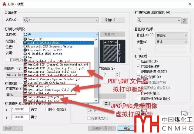 從截圖中可以看出CAD已預(yù)裝了JPG和PNG兩種圖像的虛擬打印驅(qū)動(dòng),另外還有多種輸出PDFDWF的虛擬打印驅(qū)動(dòng),其中PDF的種類最多,有針對(duì)各種需求的。