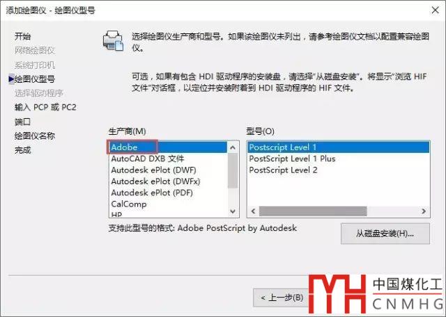 在生產(chǎn)商框中選擇ADOBE,再右側(cè)選擇PostScript Level 2,單擊下一步按鈕。