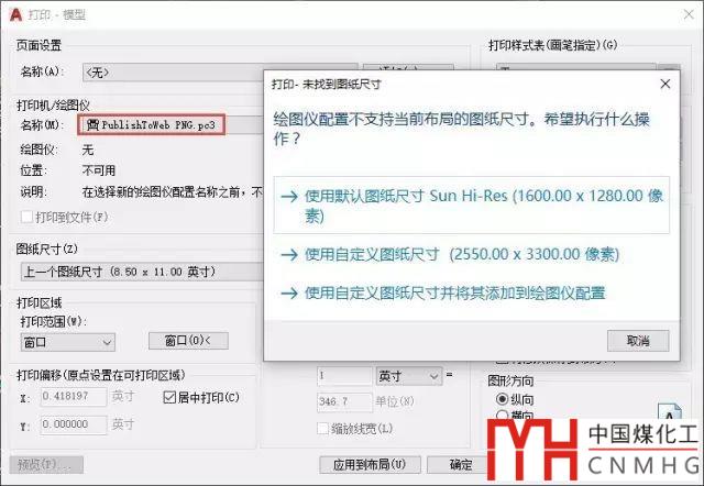 打開(kāi)一張圖紙,打開(kāi)打印對(duì)話框,在打印機(jī)列表中選擇PNG驅(qū)動(dòng),如果圖中之前保存了頁(yè)面設(shè)置并設(shè)置的是常規(guī)的打印驅(qū)動(dòng),可能會(huì)提示未找到圖紙尺寸,如圖所示。