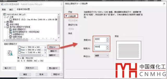 單機(jī)添加按鈕,會(huì)彈出一個(gè)向?qū)?duì)話框。單擊進(jìn)入下一步,就可以輸入PNG圖像橫向和縱向的像素點(diǎn)數(shù),例如可以輸入8000和6000,如圖所示。