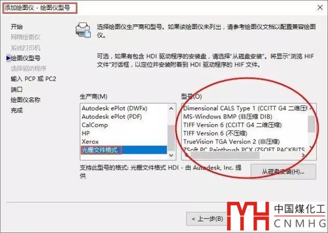在向?qū)?duì)話框中點(diǎn)擊下一步,直到出現(xiàn)選擇繪圖儀型號(hào)的頁(yè)面,再生產(chǎn)商選框中選擇“光柵文件格式”,如圖所示。