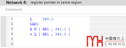 前兩行將指針常數(shù)(P#5.0)加載到AR1中,第三行對(duì)M6.1進(jìn)行與運(yùn)算,結(jié)果存放到Q7.5中。指針常數(shù)P#5.0的二進(jìn)制數(shù)為:2#0000 0000 0000 0000 0000 0000 0010 1000,可見(jiàn)它的第24~26位及第31位均為0。由于指針中不包含存儲(chǔ)區(qū)標(biāo)識(shí)符信息,所以必須在程序中指定。