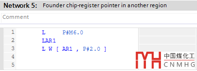 前兩行代碼將位存儲(chǔ)器指針P#M6.0加載到AR1中,由于指針中包含了存儲(chǔ)區(qū)代碼(011),因此程序中不用寫(xiě)存儲(chǔ)區(qū)標(biāo)識(shí)符,只需要指定訪問(wèn)的寬度即可。上例中的第三行的代碼會(huì)將MW8的內(nèi)容裝載到累加器1(ACCU1)中。