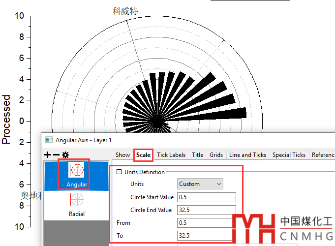 選中左側(cè)的Angular,并切換到Scale頁(yè)面,將Units設(shè)為Custom,Circle Start Value和Circle End Value(From和To)分別設(shè)置為0.5和32.5(因?yàn)榇死又蟹诸悢?shù)據(jù)的個(gè)數(shù)為32,所以設(shè)置為0.5-32.5,這兩個(gè)數(shù)值根據(jù)實(shí)際情況而定)。