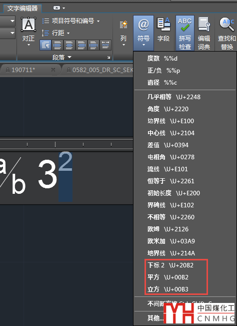 如果輸入公差,堆疊文字顯然是最好的選擇,如果只是單純的平方、立方,用堆疊輸入就比較麻煩了。平方和立方還有更簡(jiǎn)單的輸入方法,在多行文字編輯器中右鍵,在右鍵菜單的“符號(hào)”列表中可以找到平方、立方等很多符號(hào),直接從列表中選取就好了,如下圖所示。