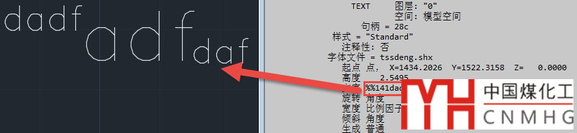 有些SHX字體可以通過控制碼在單行文字中輸入%%u(下劃線)、%%d(度數(shù))、%%c(直徑)、%131(鋼筋符號(hào))等等,有些字體里也支持輸入上下標(biāo),比如說大家比較常用的tssdeng.shx字體中輸入%%141就是表示后面的字符將變成上標(biāo),直到輸入%%141結(jié)束,輸入%%142就可以開始輸入下標(biāo),如下圖所示。