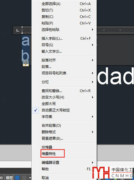 其實(shí)很簡(jiǎn)單,選中一個(gè)已設(shè)置堆疊的文字,右鍵,在右鍵菜單中就可以找到“堆疊特性”,如下圖所示。