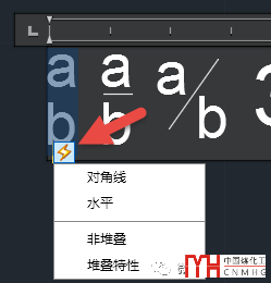 CAD高版本還提供了更快捷的設(shè)置,選中堆疊文字后,會(huì)出現(xiàn)一個(gè)閃電的圖標(biāo),點(diǎn)擊此圖標(biāo),也會(huì)彈出堆疊設(shè)置相關(guān)的菜單,如下圖所示。
