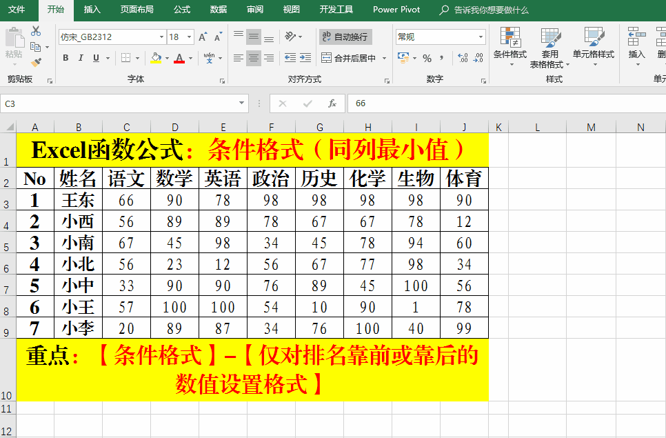 目的:將所有人員“語文”成績的【最低】值填充為“黃色”。