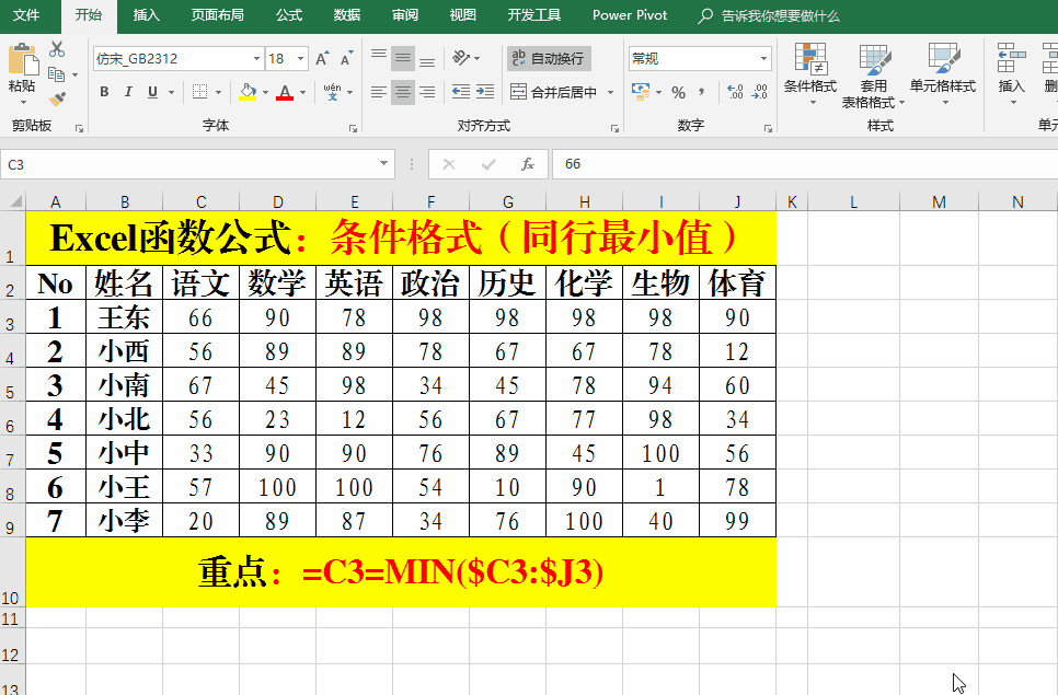 目的:將“王東”所有學(xué)科的【最低】成績填充為“紅色”。