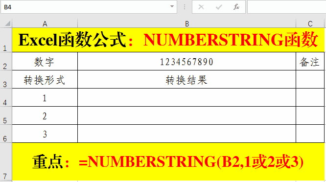 在目標單元格中輸入公式:=NUMBERSTRING(B2,1或2或3)。