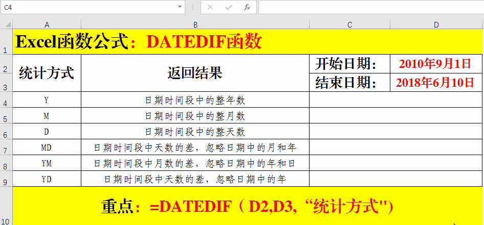 在目標單元格中輸入公式:=DATEDIF(D2,D3,"統(tǒng)計方式")。