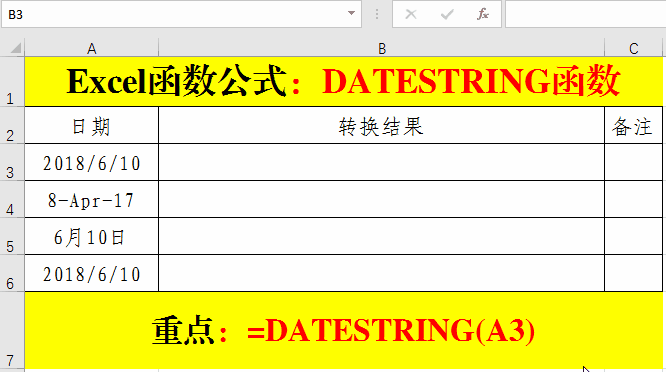 DATESTRING函數(shù)的主要作用是:將任何格式的日期轉(zhuǎn)換為“年月日”的形式。