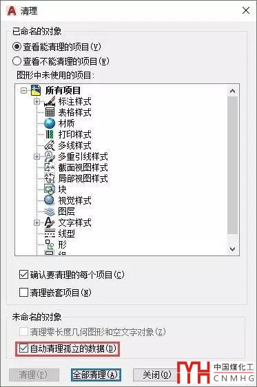 這里先將清理的方法告訴大家:輸入PU,回車(chē),執(zhí)行清理命令,在清理對(duì)話(huà)框中勾選“自動(dòng)清理孤立的數(shù)據(jù)”選項(xiàng),如下圖所示。