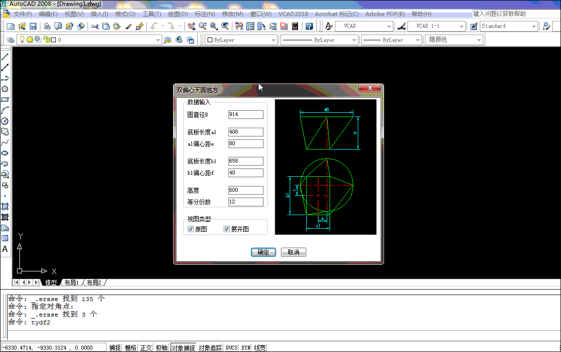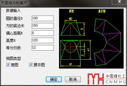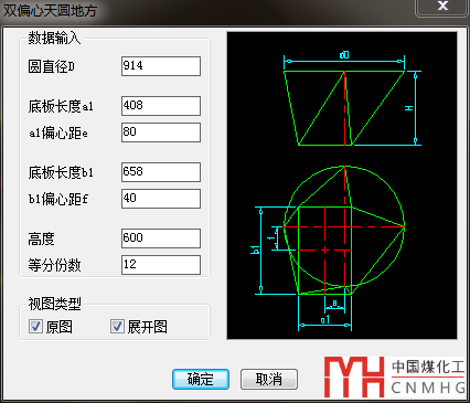 通過輸入圓直徑,底板的長度寬度,以及底板的偏心距離,自動獲得展開圖形。