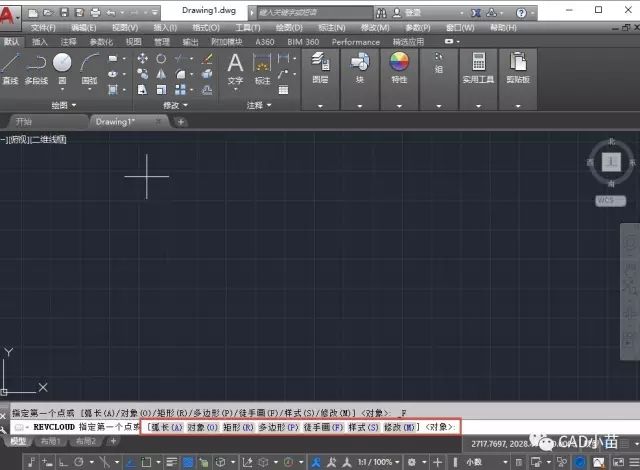 在命令面板中單擊徒手畫修訂云線或者輸入REVCLOUD后回車,執(zhí)行修訂云線命令,軟件會提示指定云線的第一點(diǎn),并列出了以大堆選項(xiàng),如圖所示。