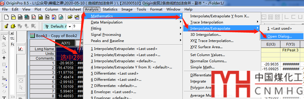 選擇XY兩列,菜單數(shù)學-插值外推-對話框;