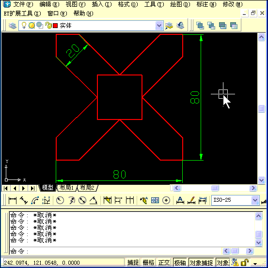 這個圖的繪圖思路很簡單,先畫一個80X80的正方形,然后連對角線,然后將對角線向兩側(cè)各偏移10,然后利用繪制好的圖形來獲取中間矩形的尺寸,然后修剪掉多余的圖形即可。我們先來看看網(wǎng)上流傳的教學(xué)視頻,注意看命令行提示,如果不仔細(xì)看,可能會看不清楚。