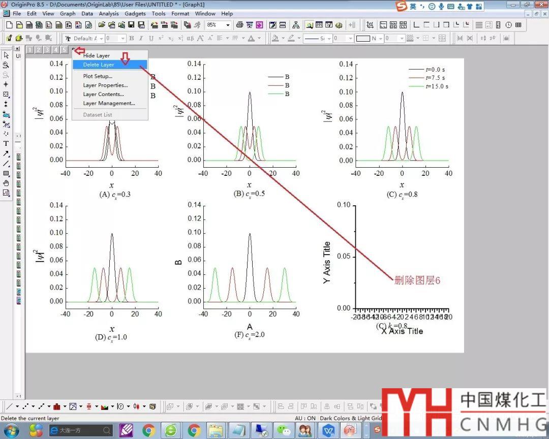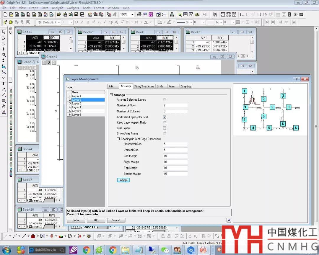 然后,繪制其中一個(gè)數(shù)據(jù)表對(duì)應(yīng)的曲線,在繪圖區(qū)左上角 1右側(cè)空白處點(diǎn)擊右鍵,選擇“Layer Management…”,在彈出的對(duì)話框(圖4)中填寫行(Rows)、列(Columns)的數(shù)字,這里填寫2行、3列共6圖層(因?yàn)橐L制5張子圖,第6個(gè)圖層將在最后刪除。)