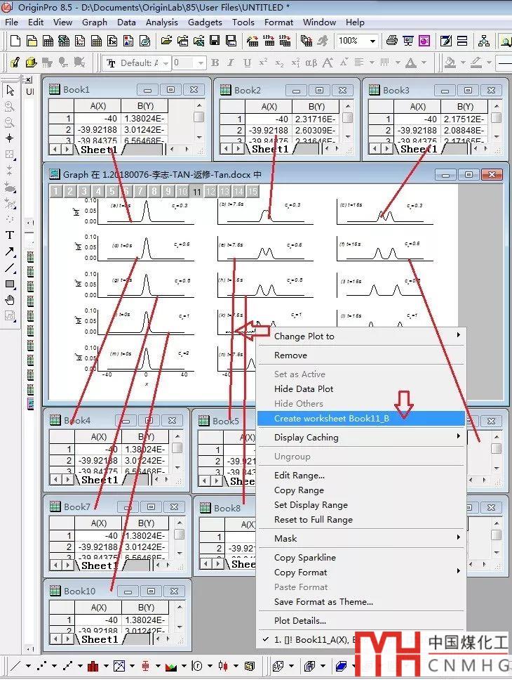 首先,從原圖中找到每個(gè)圖對(duì)應(yīng)的數(shù)據(jù)表。如圖3所示,點(diǎn)擊某曲線,在右鍵菜單中點(diǎn)擊“Create worksheet Book… ”提取出數(shù)據(jù)表。將每條曲線的數(shù)據(jù)表按照時(shí)間維度排列。