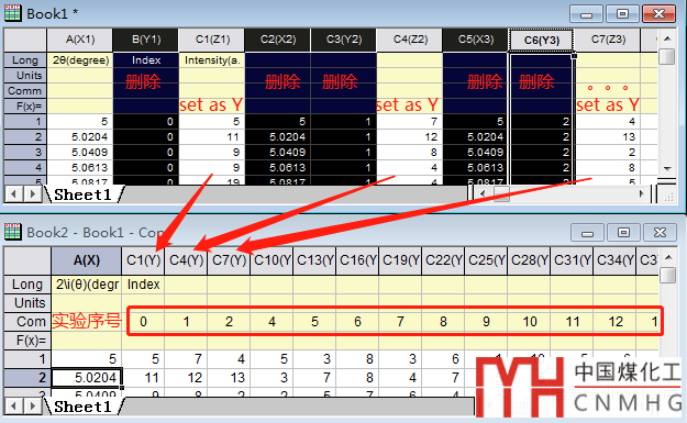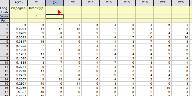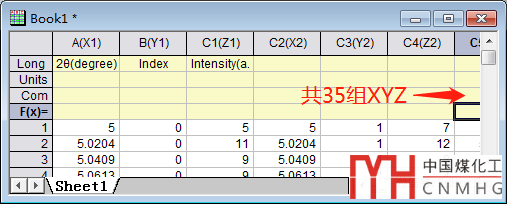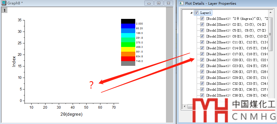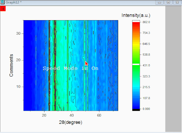 數(shù)據(jù)表結(jié)構(gòu)不符合,應(yīng)該整理成XYY型。刪除相同的數(shù)據(jù)列(所以序號(hào)的2θ變化是一樣的,刪除,只保留第一個(gè)序號(hào)的2θ,其他序號(hào)的共用2θ),然后選中后續(xù)各序號(hào)的Z列,set as Y。再在comments中添加序號(hào)0,1,2,3……。