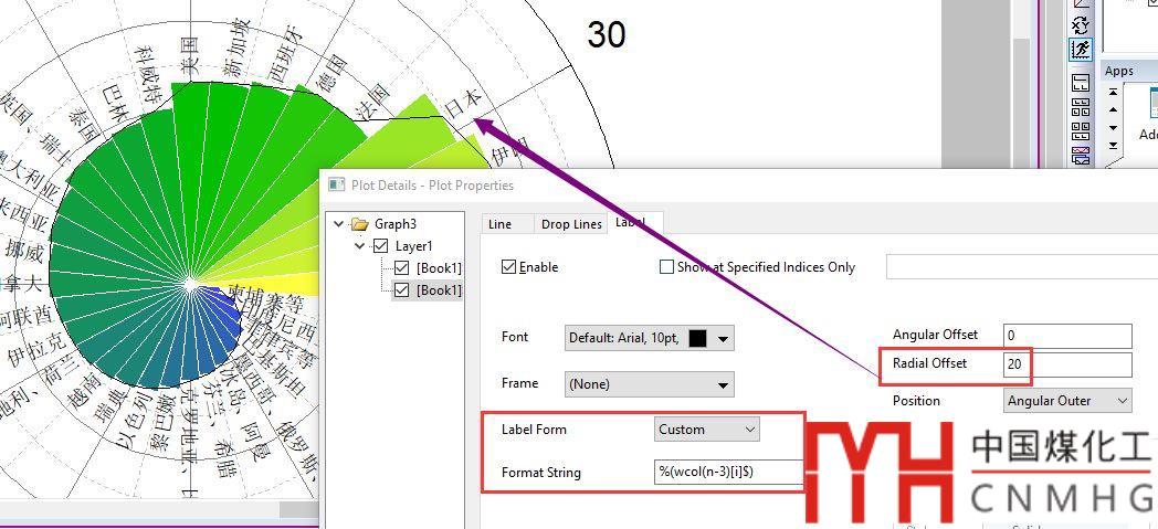 此時Label默認的是Y軸數據,可以通過自定義的形式顯示我們需要的標簽。在Label From中選為Custom,在Format String中填入“%(wcol(n-3)[i]$)”,意思是當前數據所在列往前數3列、當前數據所在行所對應的數據數據。同時可以設置Offset,調整標簽的位置。