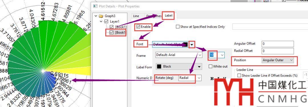 雙擊添加的曲線進入Plot Properties對話框,切換到Label頁面,點擊Enable,在Font中設置字號,Rotate設為Radial。同時Position設為Angular Outer。