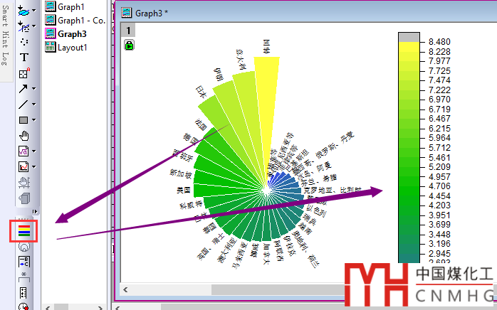 選中極坐標系中的條形圖,點擊左側的Color Scale工具,添加Color Scale Bar。